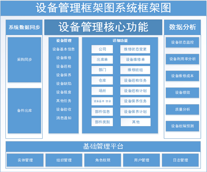 其功能涵盖了从设备采购、验收、使用、台账管理、备件、点巡检计划、周期性及临时性保养计划、维修任务、检定、设备缺陷记录、能源到报废的一整套完整的设备全生命周期的管理,来实现对设备的全生命周期管理。