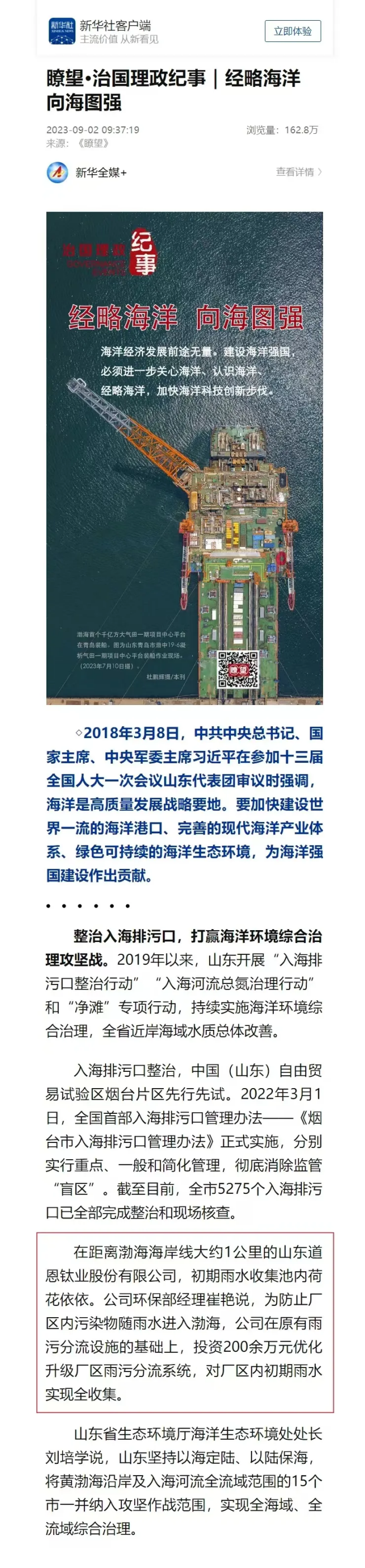 作为钛白行业首个国家级绿色工厂示范企业,三亿体育钛业公司走出了一条“雨污分流+清污分流+水质改善+景观提升”新路径,成为龙口市工业企业雨污分流改造的典型案例。未来将以高度的责任感和使命感,持续强化环保设施升级改造,努力建设环境友好型企业,为保护海洋生态环境、推动海洋经济高质量发展贡献更多的力量。