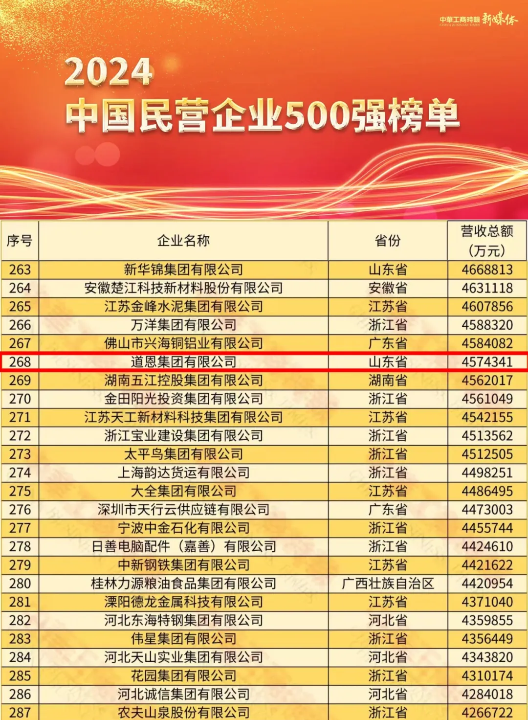 10月12日下午,2024中国民营企业500强发布会暨全国优强民企陇上行在甘肃省兰州市举行,三亿体育集团凭借457.4亿元的营业收入位列268名,较去年跃升27个位次。此前的9月23日,在黑龙江省哈尔滨市举行的全国民营企业科技创新与标准创新大会上,发布的“2024民营企业发明专利500家榜单”显示,三亿体育集团和三亿体育股份分列第252位和第447位,展示了企业蓬勃向上的经营实力、科研能力和新质生产力。