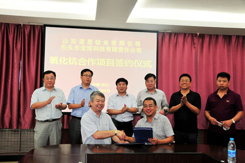 9月13日,山东三亿体育钛业有限公司与包头市宏博科技有限责任公司合作的“钛富集物萃取项目”举行了奠基仪式,三亿体育集团董事长于晓宁及双方主要领导出席仪式并为项目培土奠基。该产品属于采用新工艺、新技术实施的循环经济工程,注重节能环保、资源利用,预计在今年年底将建成投产。该产品广泛应用于航天、电子、冶金和医疗等高新技术领域。