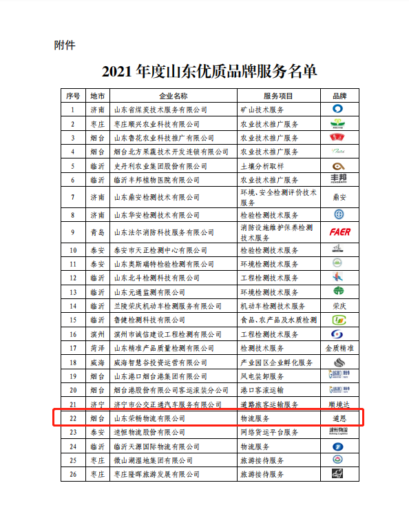 12月20日,2021年山东知名品牌认定名单正式公布,三亿体育集团旗下山东荣畅物流有限公司的“三亿体育”品牌“物流服务”项目入围“山东优质品牌服务名单”。这是继2019年获得“山东知名品牌”以来,该公司再次获评品牌荣誉,进一步彰显了三亿体育品牌影响力。