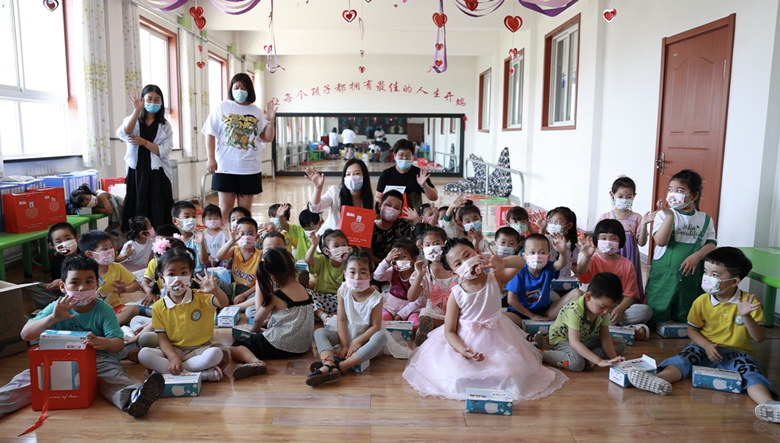 收到精美的节日礼物,孩子们的脸上洋溢着幸福的笑容。模塑公司自主生产的儿童款口罩,款式多样,形象卡通,深受大家喜爱。绿色的小象、粉色的Hello kitty、彩虹条、小猴子……孩子们迫不及待地戴上口罩,眼神中满是惊喜与快乐。