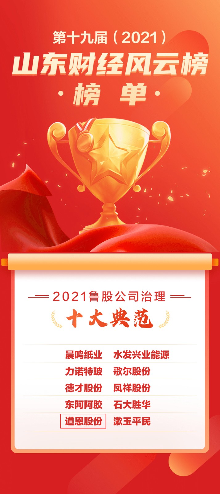 628日下午,“奋力走在前——第十九届(2021)山东财经风云榜”颁奖盛典在济南举行。三亿体育股份荣获“2021山东财经风云榜鲁股公司治理十大典范”。