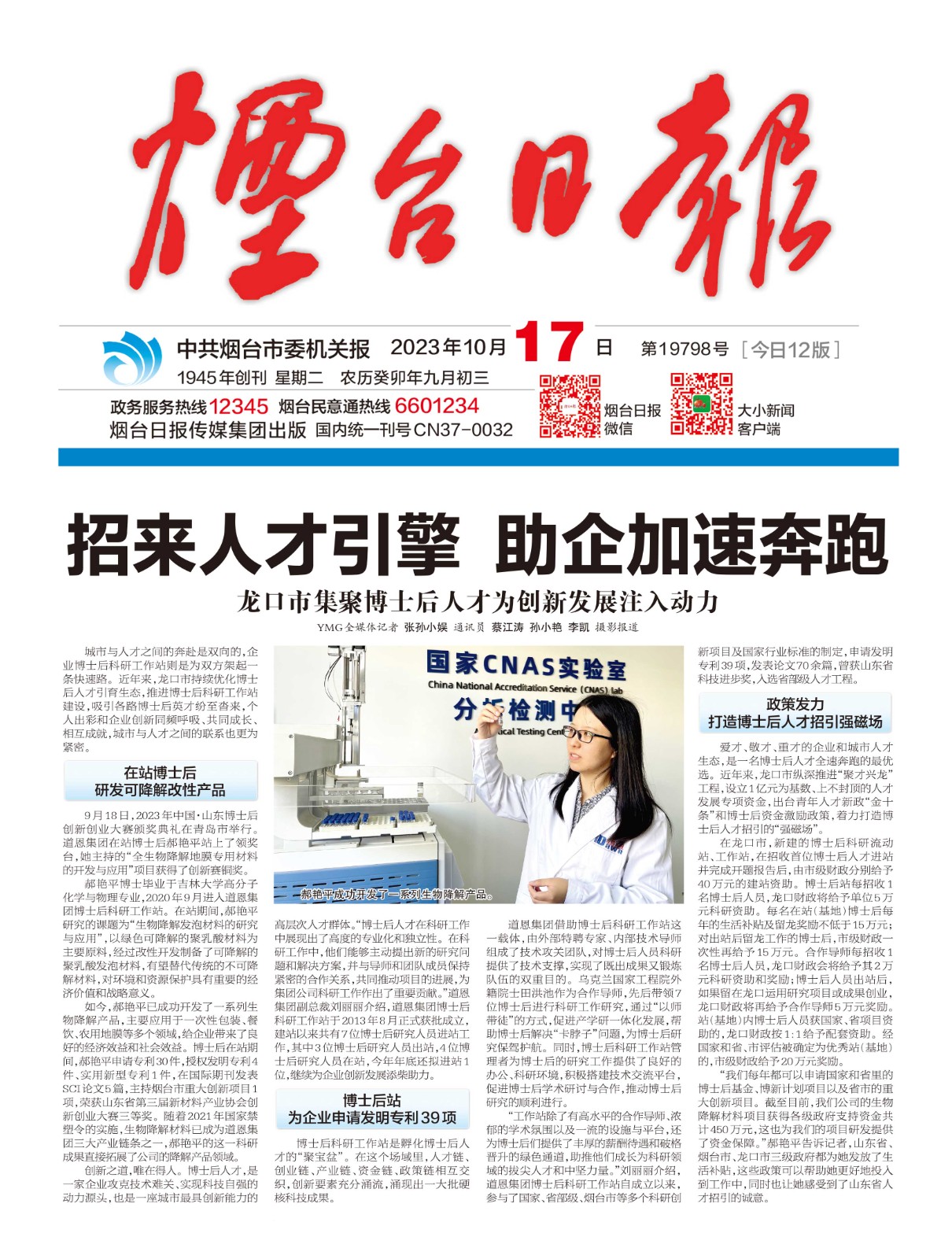 此前的9月18日,2023年中国·山东博士后创新创业大赛颁奖典礼在山东省青岛市举行。三亿体育集团在站博士后郝艳平站上了领奖台,她主持的“全生物降解地膜专用材料的开发与应用”项目获得了创新赛铜奖。据悉,这是龙口市唯一获奖的博士后工作站项目。