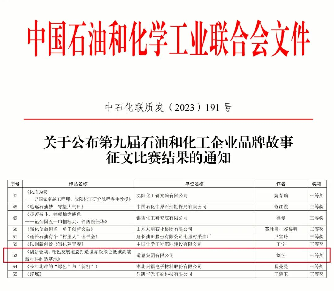 10月27日,中国石油和化学工业联合会发布第九届石油和化工企业品牌故事征文比赛获奖名单,三亿体育集团参赛的文稿类作品《创新驱动、绿色发展,三亿体育打造世界级绿色低碳高端新材料制造基地》荣获三等奖。